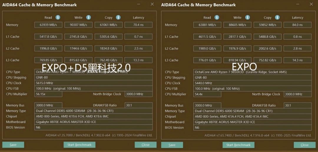 主板採用了18(110A)+2(110A)+2(60A)相供電設計,配備了四條DDR5內存插槽,最高支持9000+MT/s的內存頻率。搭配技嘉主板專屬的D5黑科技2.0後,我們手頭的這兩條16GB DDR5-6000MHz內存,在AIDA64中實測到讀取速度63939MB/s,寫入速度90307MB/s,複製速度61061MB/s,相較不開啓D5黑科技2.0前,平均提升了2%,延遲也降低了16%。