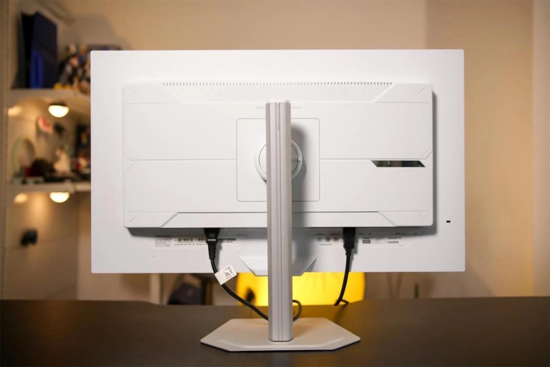 轉到背部,也是一體化的純白設計,表面用了線條紋理和品牌LOGO做點綴,簡單利落地彰顯其電競顯示器的定位。