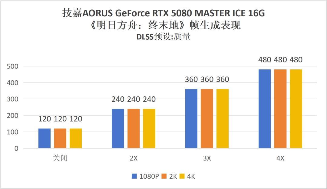 我們也實際測試了《明日方舟:終末地》在這塊技嘉AORUS GeForce RTX 5080 MASTER ICE 16G顯卡上的運行表現。但就像上面提到的,這塊顯卡的性能對《明日方舟:終末地》這樣的二游來說絕對是溢出的,即便你在遊戲中搭建了極爲複雜的自動化項目,畫面上同時有十多條生產線在運作,遊戲畫面也不會出現任何卡頓發熱情況。我們測試了其在1080P、2K、4K分辨率下,開啓最高畫質和DLSS“質量”模式後,分別在關閉DLSS幀生成和開啓2倍、3倍、4倍幀生成的情況下,遊戲中角色跑圖的幀數表現,結果就是每次都能穩定跑滿遊戲在不同幀生成檔位下的幀數上限,完全沒有任何負載壓力。