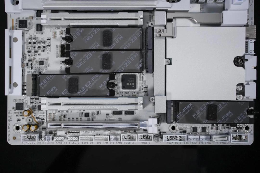 再往下方的大面積金屬散熱裝甲下,則是5條M.2插槽,其中兩個支持PCIe 5.0,剩餘三個則是PCIe 4.0。技嘉還爲其專門設計了全新的M.2彈性底座,可顯著改善SSD與導熱墊之間的接觸,提升散熱性能。
