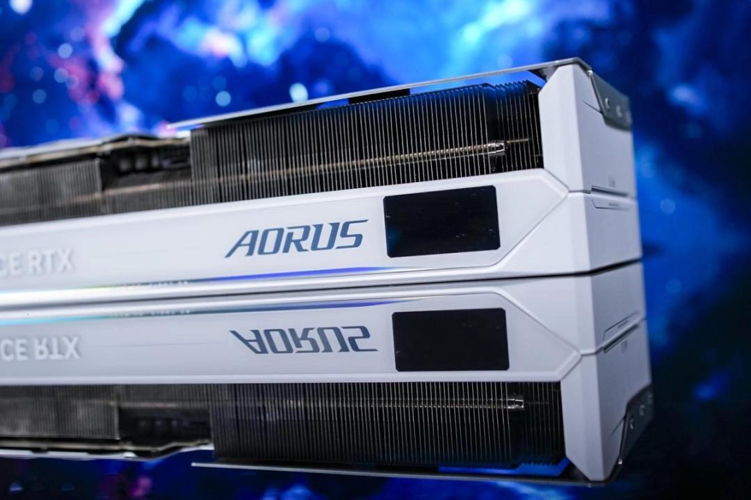 外觀設計上,依舊是純白的配色,和上面提到的兩款技嘉產品很搭。正面有棱角分明的邊框和風扇邊的彩色條紋做裝飾,整體給人的印象非常簡潔硬朗。側邊的“AORUS”標誌旁配備了一塊小的顯示屏,點亮後除了可以顯示一些顯卡的運行信息外,還可以顯示自定義的文本、圖片和GIF。