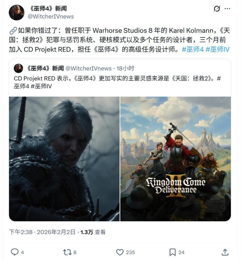 CD Projekt RED聯合CEO Adam Badowski表示,《天國:拯救2》是《巫師4》追求更強烈的真實感的核心靈感來源。他特別提到該作的模擬式玩法、營造的真實感與氛圍,以及玩家與世界互動、改變世界的衆多選擇,這些正是《巫師4》的發展方向。