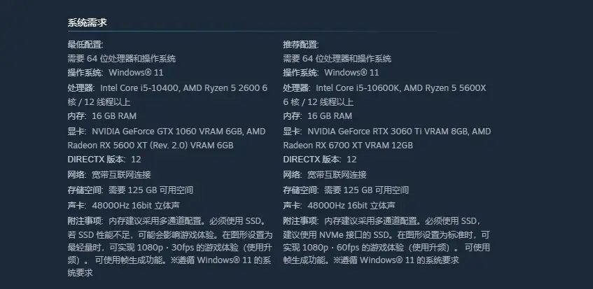 本次PC版的最低配置與推薦配置如下:最低配置需顯卡GTX 1060即可流暢運行,最高配置則要求顯卡RTX 3060 Ti。據玩家試玩版實測,搭載13600CPU+9070XT顯卡的設備,開啓FSR 3.1、接近最高畫質設置下,可穩定60幀運行,整體表現流暢。
