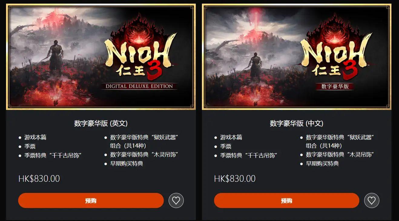 港服PSN商店目前顯示,數字標準版售價528港幣(約合人民幣469元),豪華版售價830港幣(約合人民幣738元)。豪華版除遊戲本體外,還包含季票、季票特典「千千古吊墜」、數字豪華版特典「獄妖武器」組合(共14種),以及「木靈吊飾」。