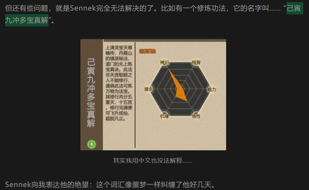 前幾年,遊研社寫過一篇文章,說他們找到了一羣靠着字典和翻譯硬啃《了不起的修仙模擬器》的海外玩家,還採訪到了羣裏的“翻譯大佬”,但翻譯大佬也是有侷限的,當他碰到“己寅九衝多寶真解”這種詞時,也得上演“完型崩潰”。