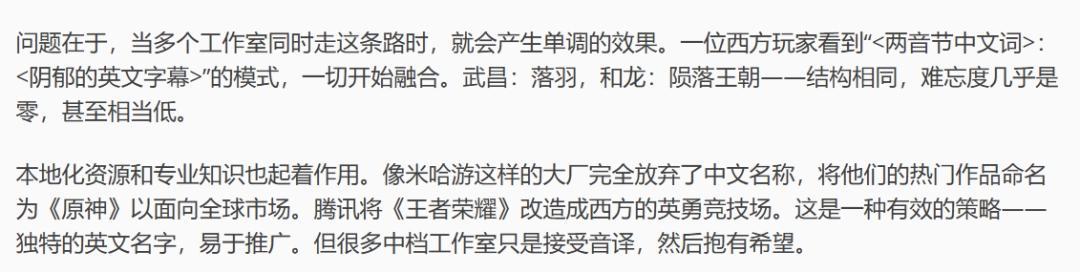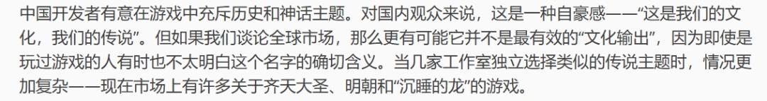 他理解使用這些詞背後的文化訴求,甚至還提到了審覈因素和市場因素帶來的影響,認爲我們的玩家會天然歡迎創作者在遊戲中大量地使用中國文化元素。但他認爲這一切有些操之過急,現在這個階段把這些都端上桌,並不能讓玩家們有什麼樣的深刻印象。