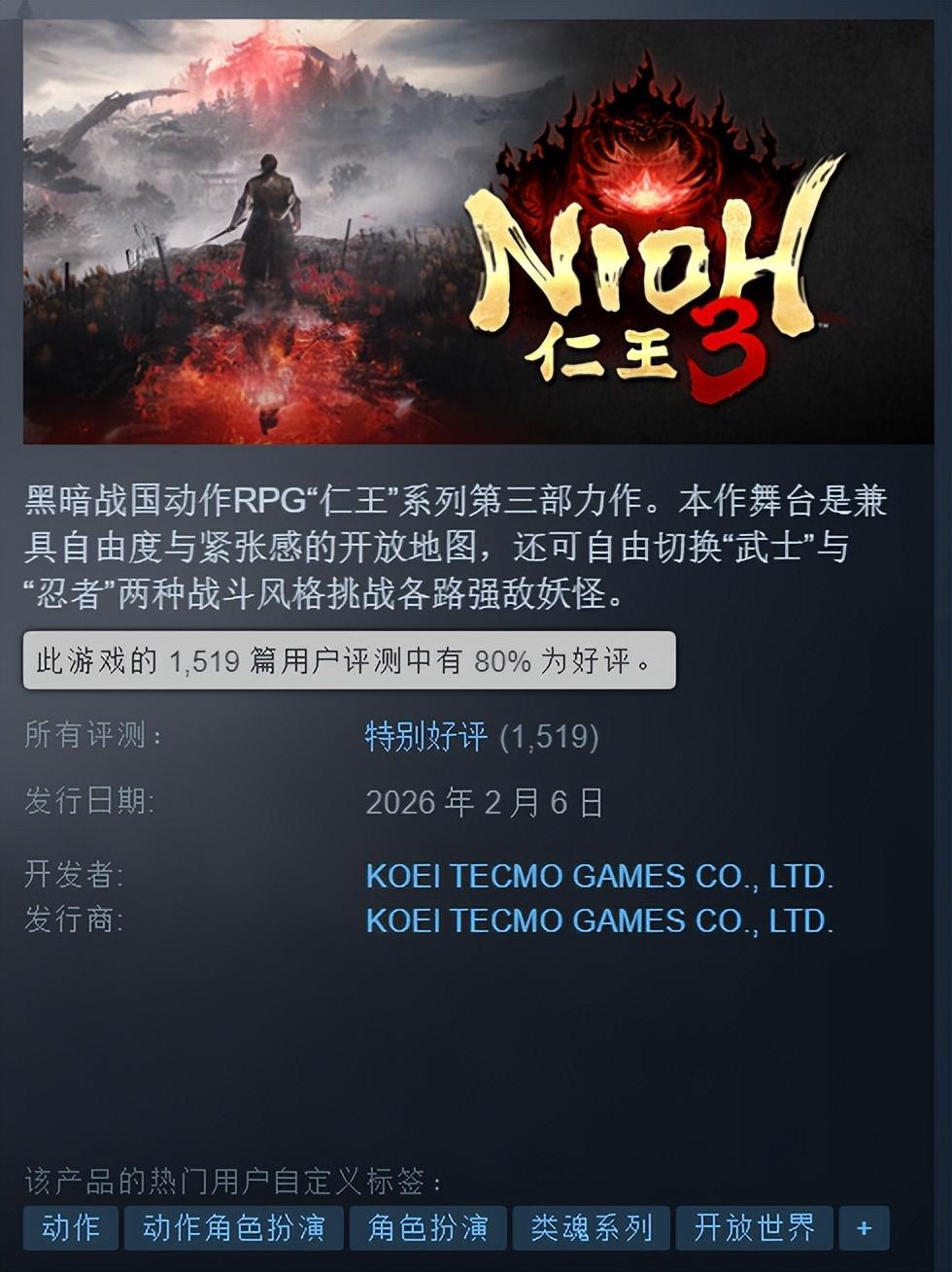 而玩家評價方面,截止到發稿時爲止,《仁王3》在Steam上的總評價爲「特別好評」,一共1519篇用戶評測,好評率達到了80%。可以說是相當優秀了。