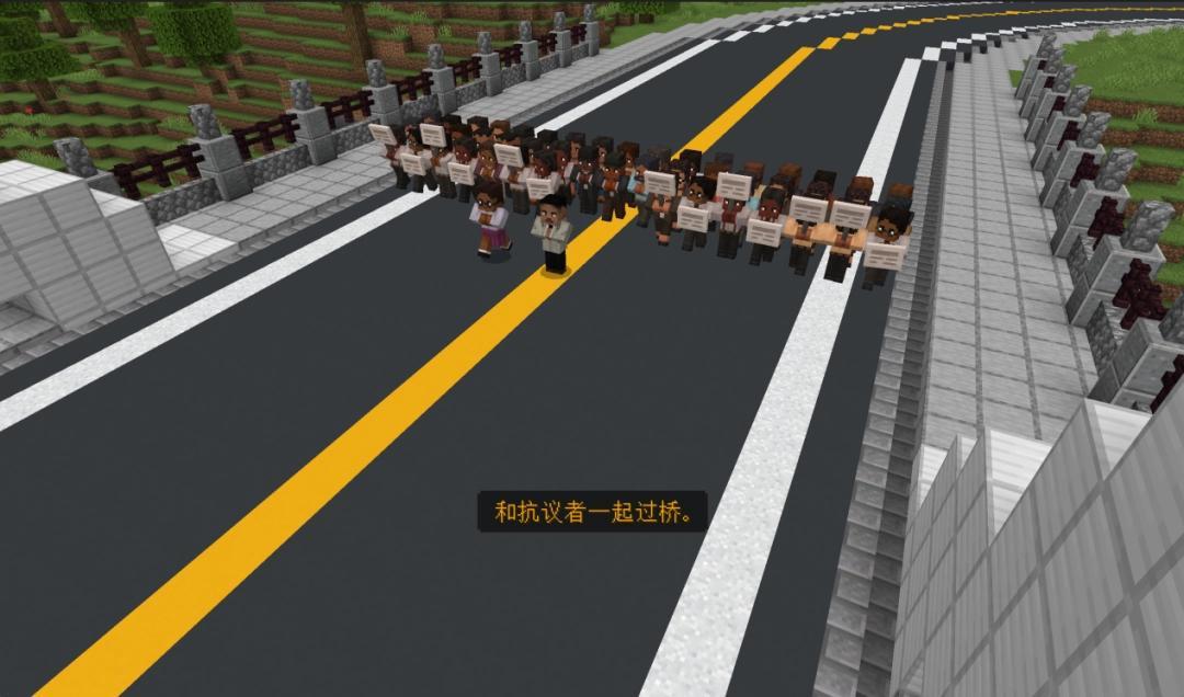 玩家全程沒有任何行動自由,不能攻擊、不能放置方塊,更不能往抗議人羣身上扔TNT,對話選項也只有嗯嗯啊啊的附和,基本上就是純粹的說教,比早八的高數課還要催眠,一個十歲的小孩只怕是堅持不到兩分鐘,就要Alt+F4關閉遊戲。