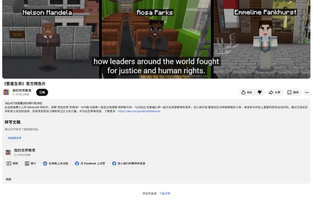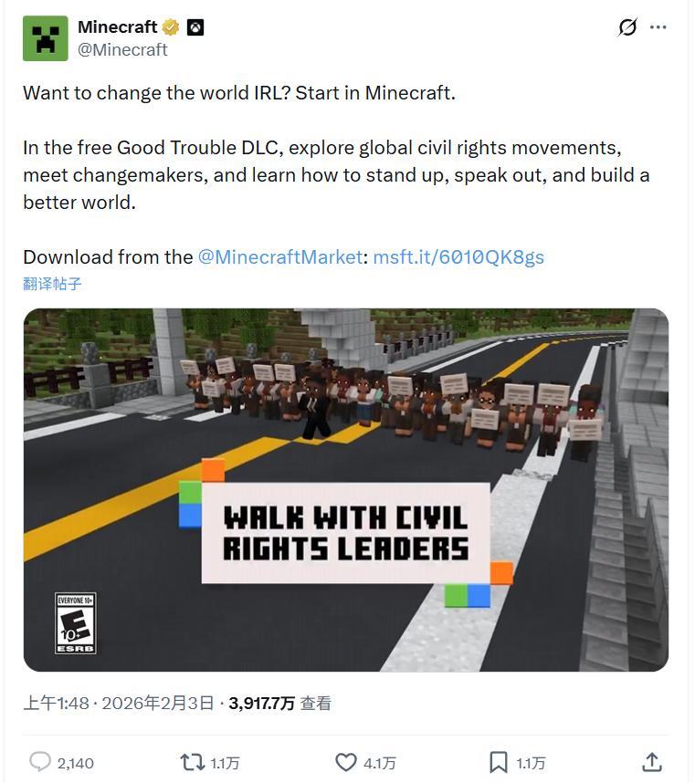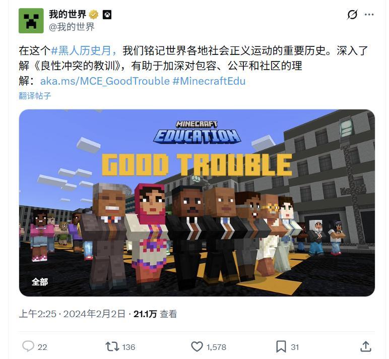 每年的二月,是美國的“黑人歷史月”。歷年這個時候,《我的世界》官推都會發布一些黑人民權運動相關的推文,雖然每次都會有網絡巨魔前來添亂,卻從未有一次被上升到如此高度——事實上,早在2024年2月,他們就發佈過《Good Trouble》相關的宣傳,而在當時,這些內容幾乎沒有引發任何關注,評論區整體上也較爲和諧。