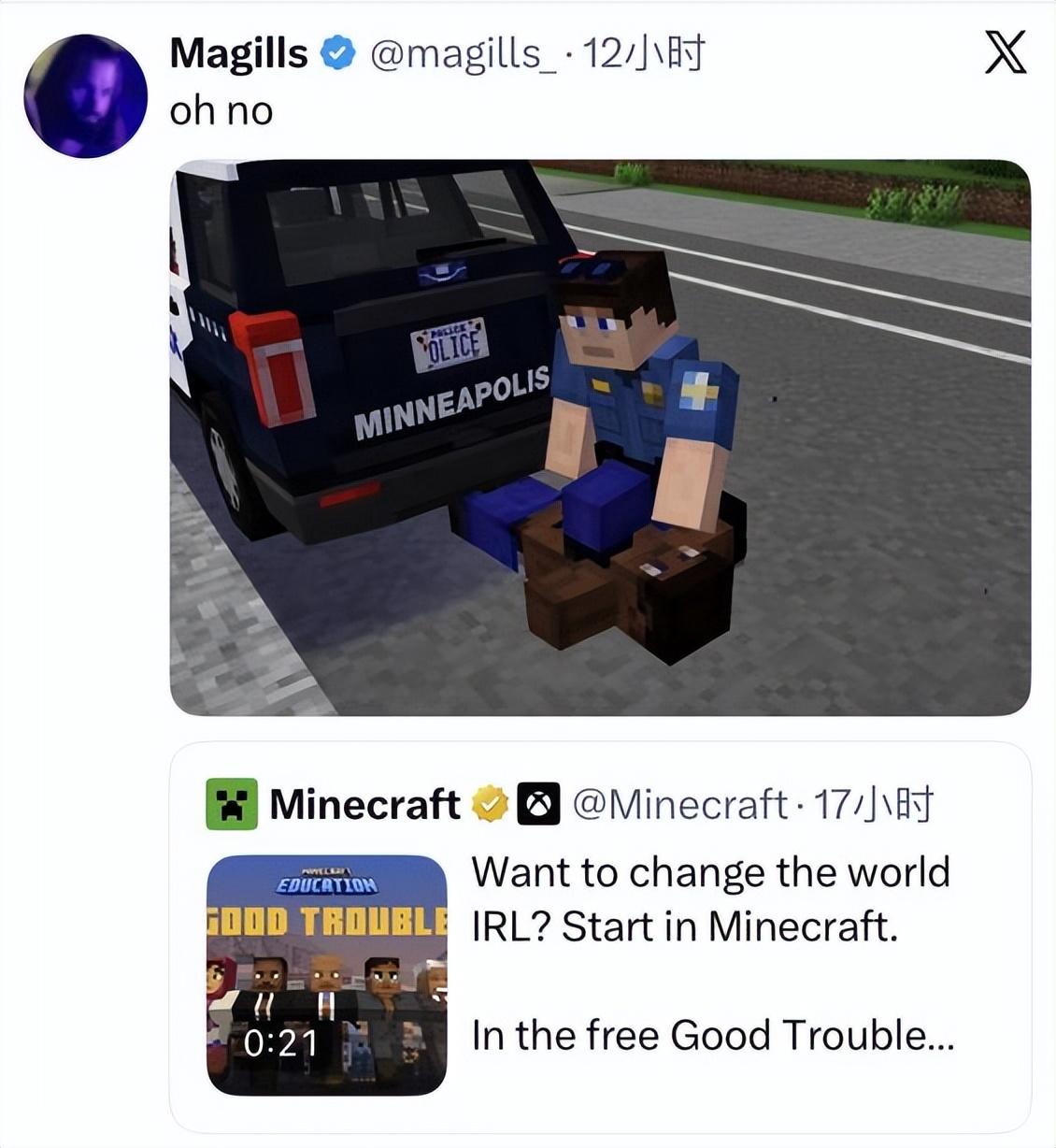 推文一經發布,就立刻在整個外網《我的世界》圈子內外,掀起了輿論風暴——《我的世界》官推的運營策略基本上是給網上火熱的各種meme套上MC的外衣再發一遍,平日的單推文瀏覽量基本在百萬上下,蹭上大熱meme才偶爾能上一千萬。而《Good Trouble》的推文瀏覽量截至目前已飆升至近4000萬,推文的評論區也幾乎被反對者完全佔據。