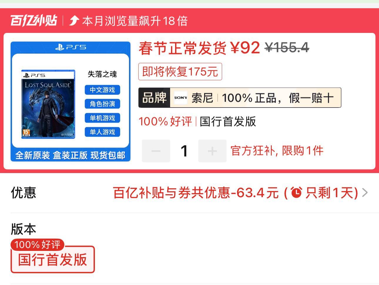 各位玩家週二好,感謝各位再次來到ACG吐槽君feichenpan的【索尼PS5實體遊戲碟好價推薦】頻道,這期給大家帶來的是2026年2月10日某多平臺上低價的PS5全新遊戲,其中PS5遊戲《失落之魂》92元全新包郵,感興趣的玩家朋友可以購入。