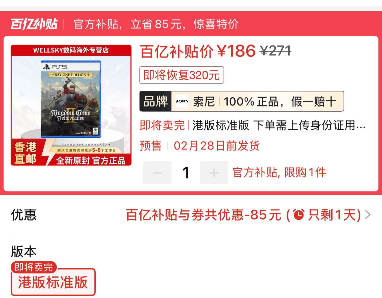 PS5港版中文遊戲《天國拯救2》186元全新包郵