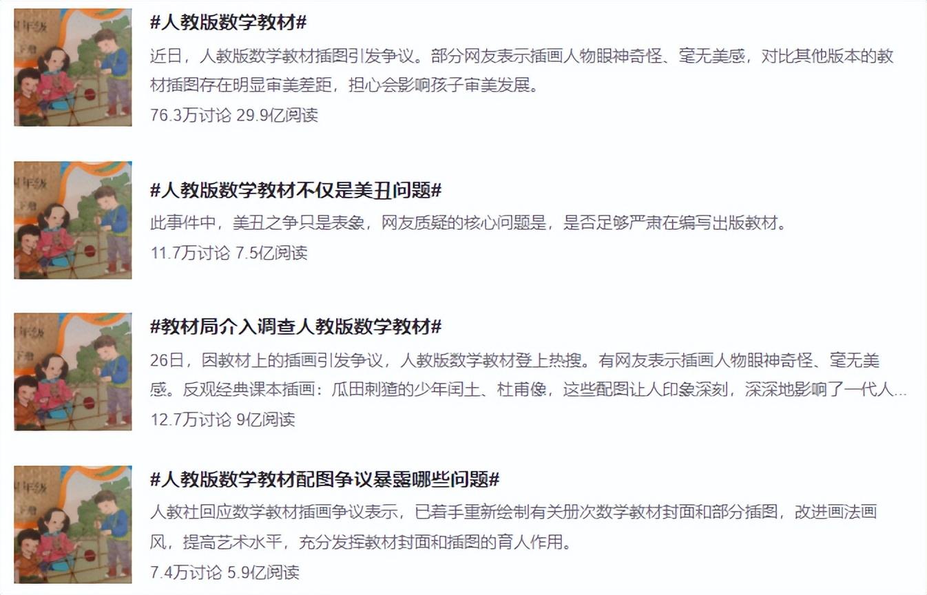 2022年年中,因爲教材中所使用的插圖在畫風上過於詭異,“人教版小學數學教材”被網友們噴上了熱搜。