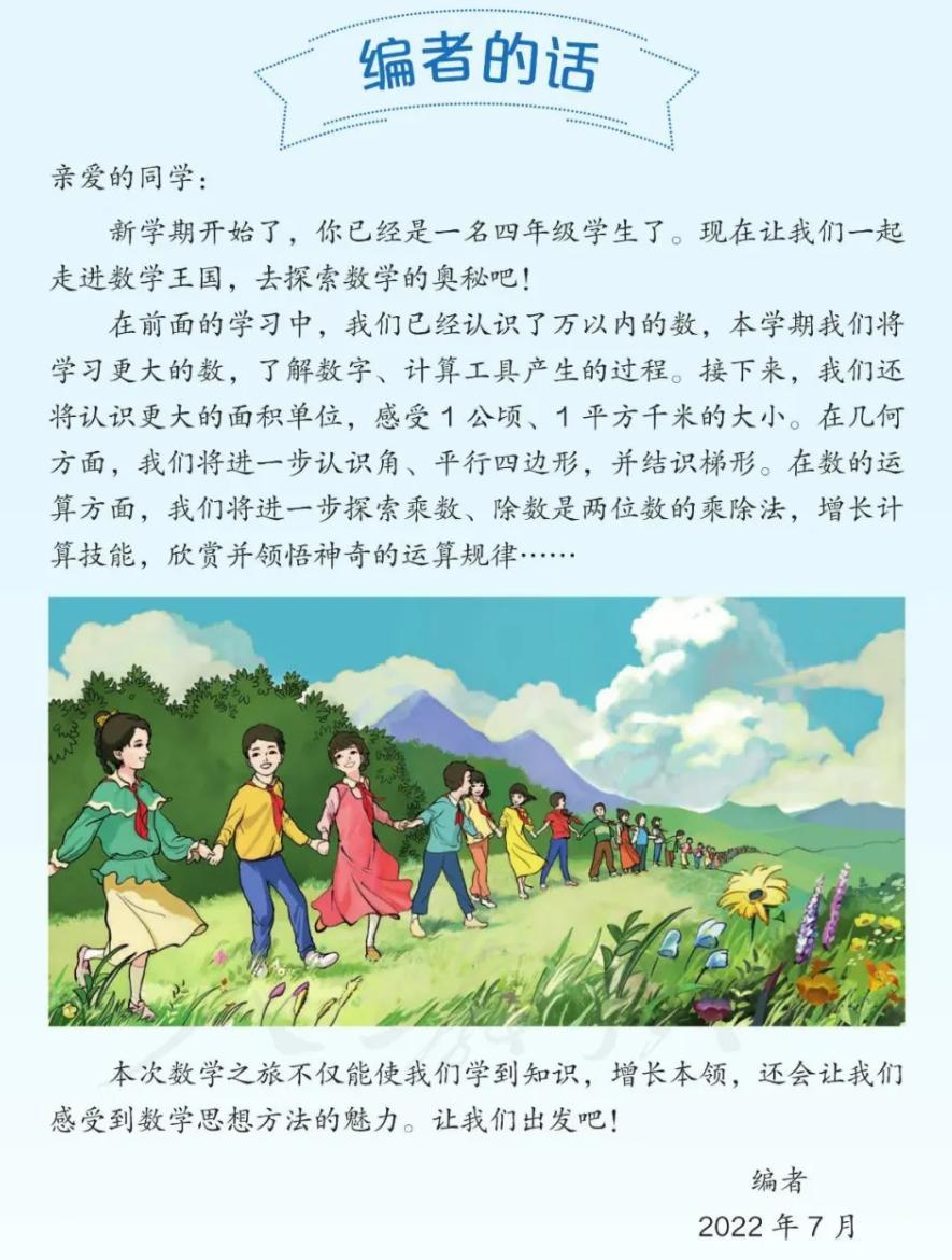 這幅插畫出自某本小學數學教材裏的一個章節,被用在教材“編者的話”部分,和一個新奇小知識上。