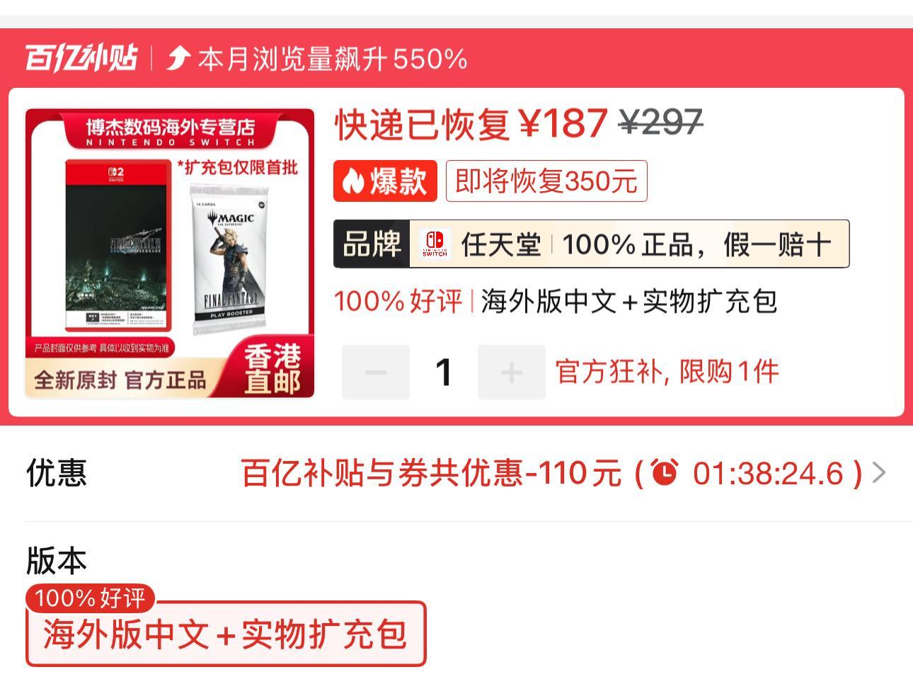 各位玩家瘋狂星期四好,好久沒更新NS2/NS實體版遊戲了,感謝各位再次來到ACG吐槽君feichenpan的【任天堂NS實體遊戲碟好價推薦】頻道,這期給大家帶來的是2026年2月26日某多平臺上低價的NS全新遊戲,其中NS2中文遊戲《最終幻想7重製版》187元全新包郵,感興趣的玩家朋友可以購入。