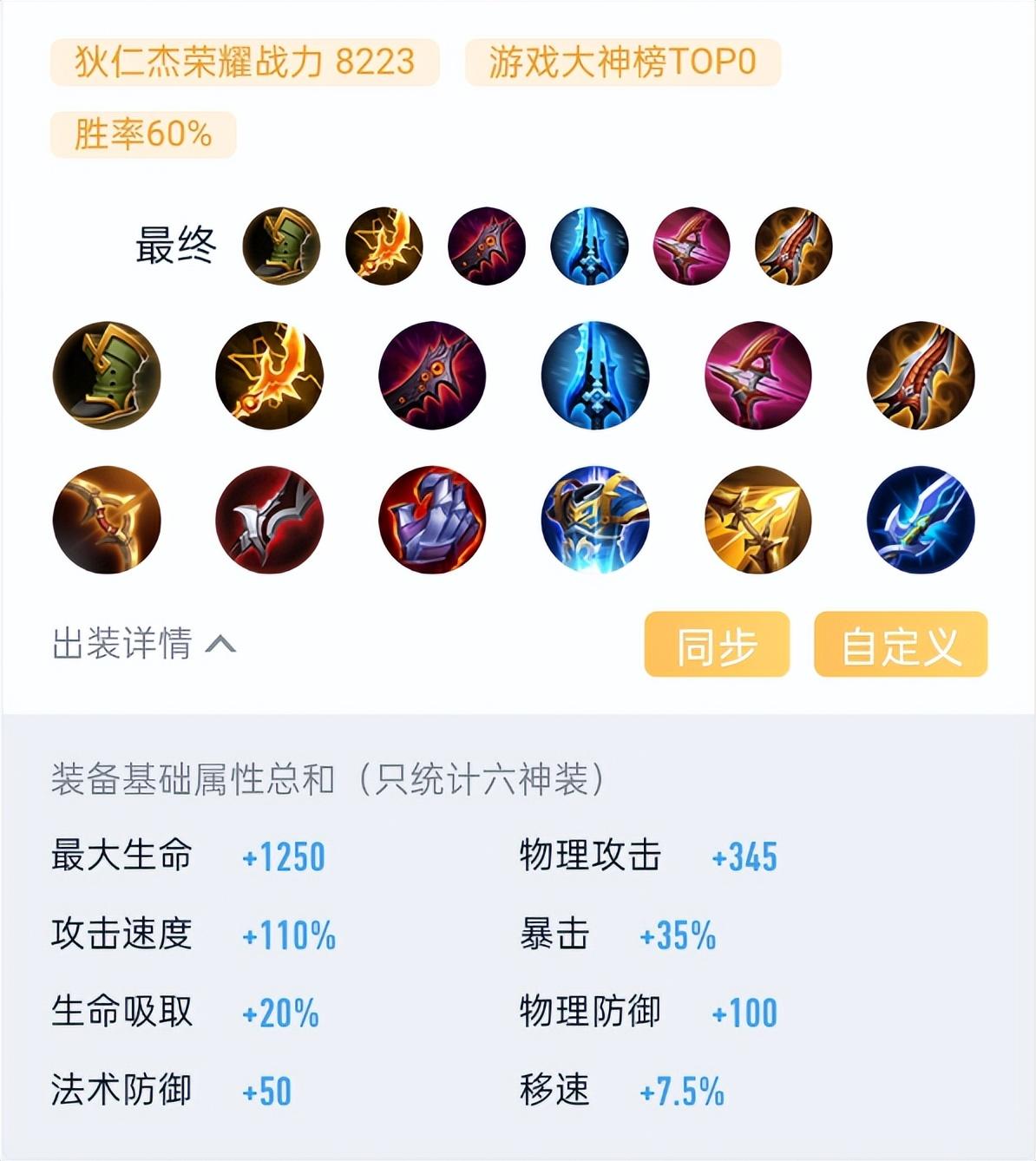 出裝邏輯:先堆攻速續航,再補穿透暴擊,兼顧輸出與生存,每一件裝備都和狄仁傑技能深度綁定: