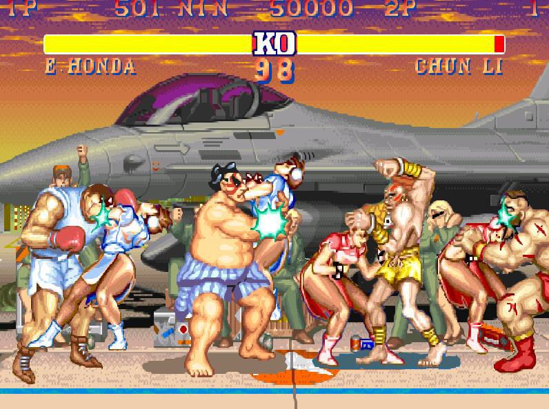 後期的《超級街頭霸王2》中,這類投技的傷害又再次得到了增強。記得當年玩15週年版,本田和布蘭卡都可以直接收走一半的血量,不知道是不是老闆故意調過的。