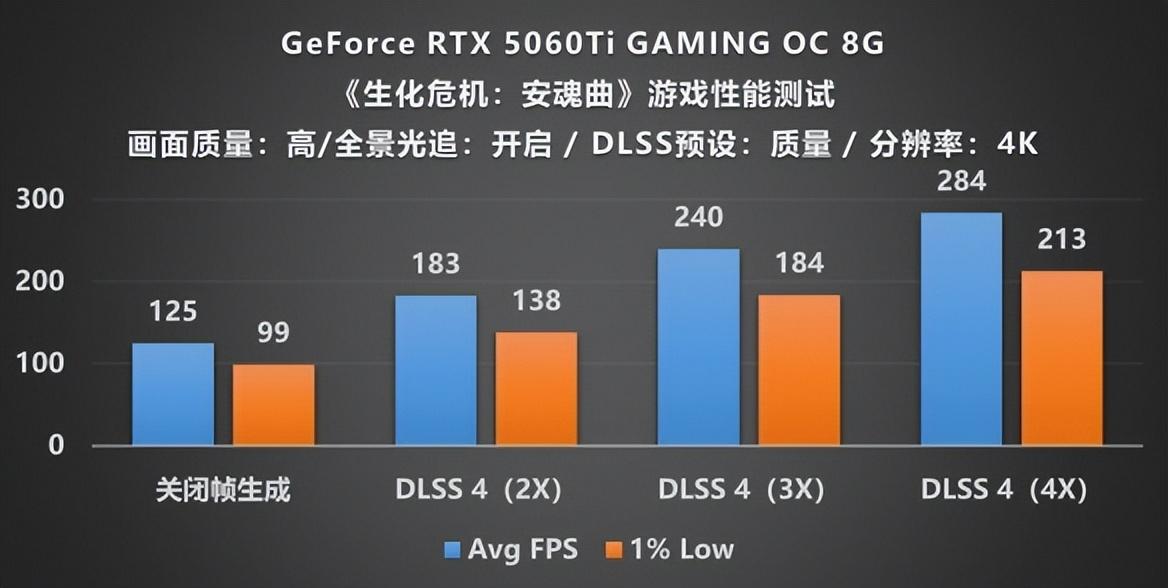 來到1080P分辨率測試,技嘉RTX 5060 Ti的表現同樣令人驚喜。關閉DLSS 4時遊戲維持在125幀的基準水平,而開啓2x幀生成後,幀數直接躍升至183幀,遊戲體驗明顯更加順滑。當開啓4x多幀生成時,幀數更是達到了284幀的超高水平,這樣的表現讓遊戲畫面絲般流暢,操作響應也更加隨心所欲。