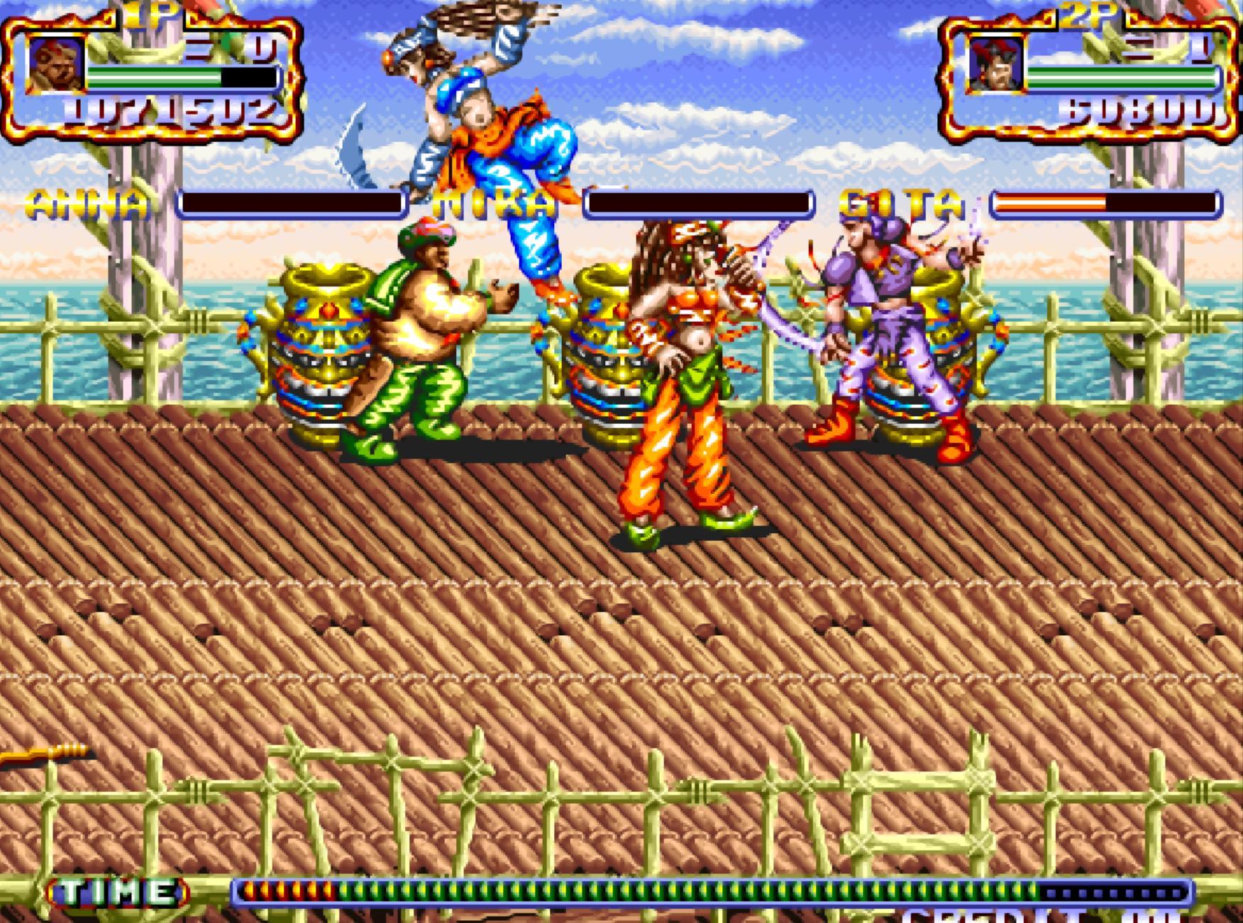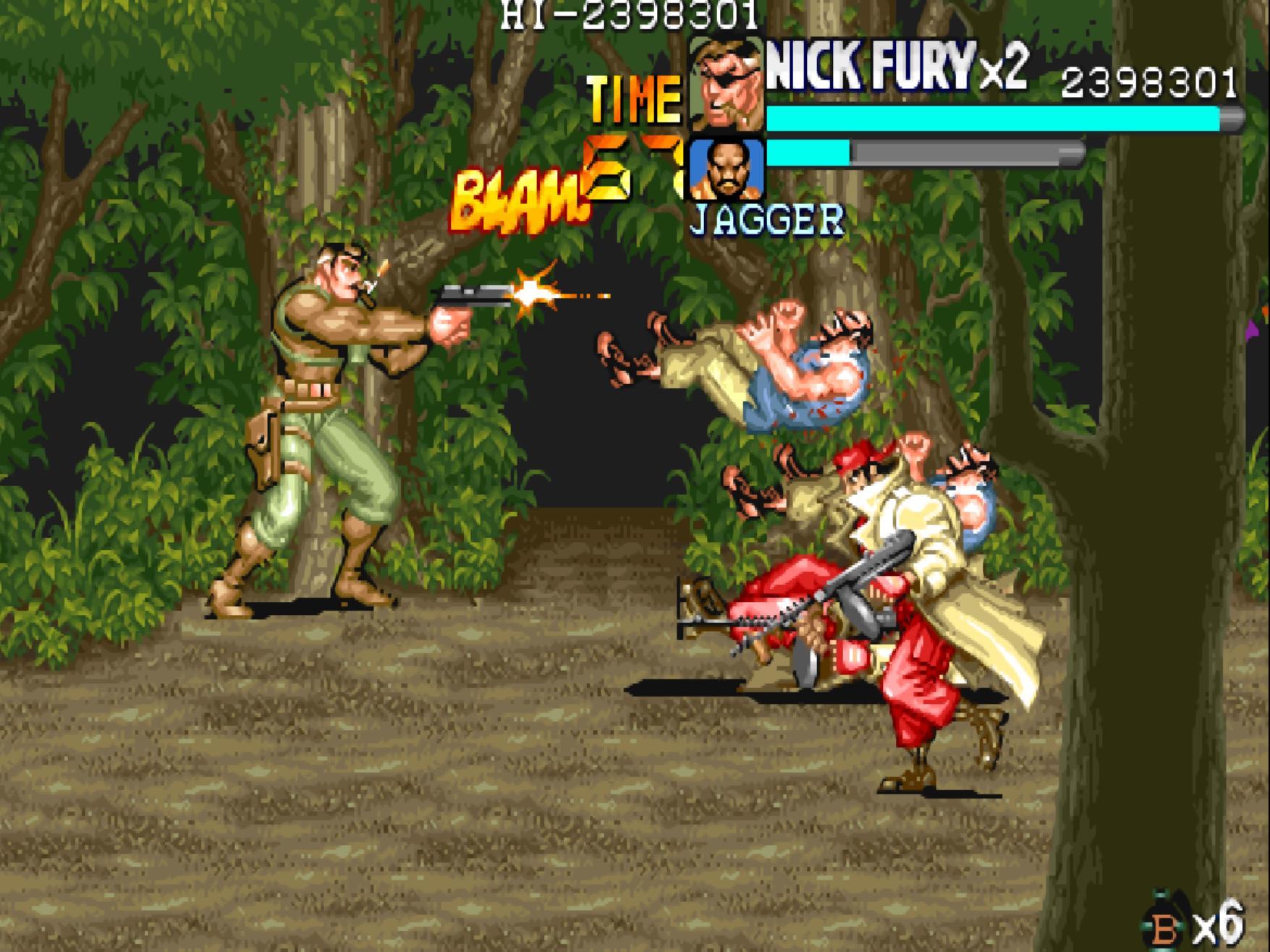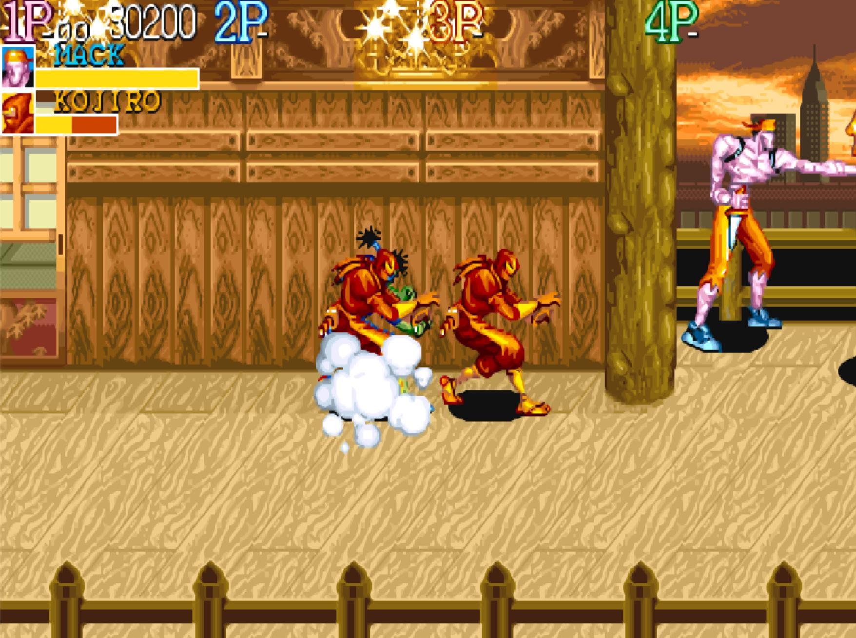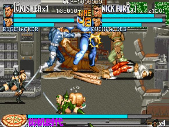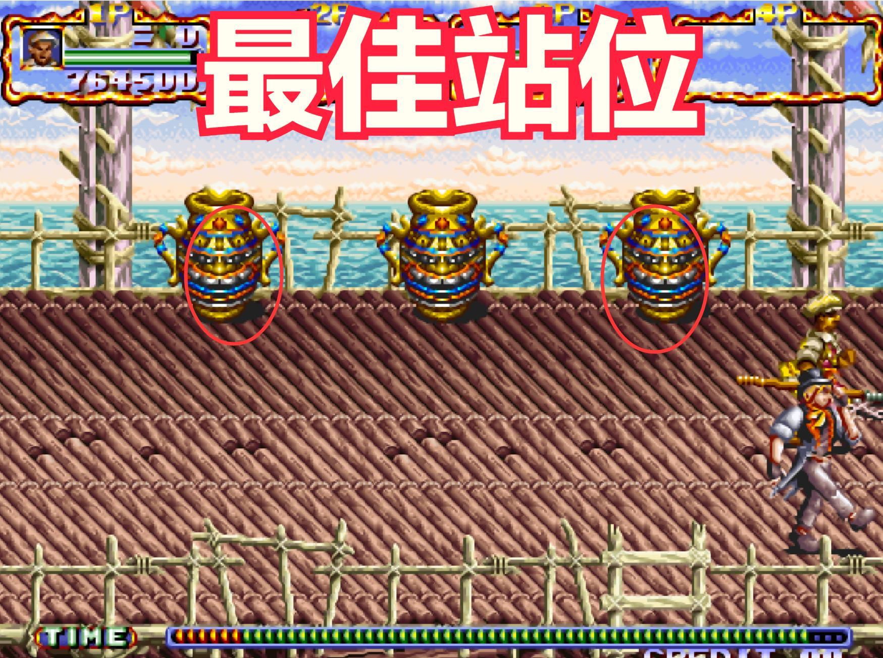 第四關,這個場景只要玩家們背靠背那就是安全的。這個應該是當年的常規操作吧!不過有的玩家喜歡亂跑,導致隊友被小兵的飛刀擊中。