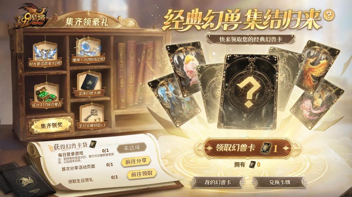 “集結經典幻獸”同樣持續到3月31日。通過每日登錄遊戲、首次分享活動、領取生日賀禮均可獲得經典幻獸卡包,開啓後隨機獲得一張經典幻獸卡。戰士攻防型、法師攻防型、如意嘟嘟、吉祥嘟嘟、不死鳥菲尼克等24只老牌幻獸以卡牌形式迴歸,集齊任一系列或全集齊可獲得品牌日限定永久跟寵、繮繩、生日寶藏鑰匙等獎勵,還有5%概率抽取全球限量500套的實體幻獸卡冊。