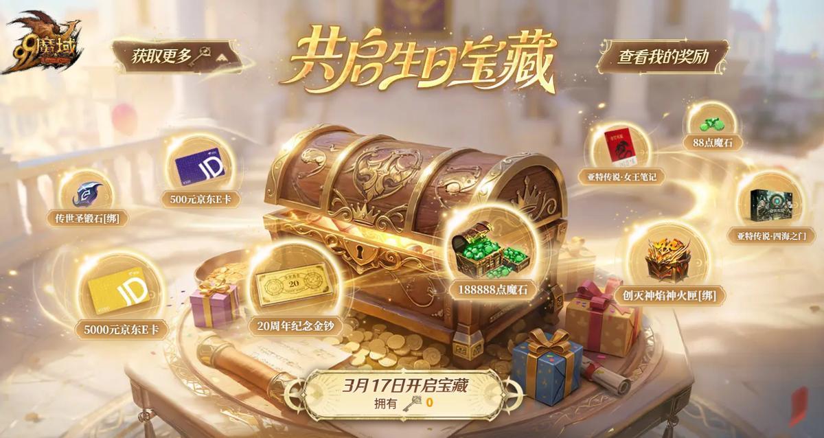 同一天,“生日寶藏”正式開啓。使用此前積攢的生日寶藏鑰匙即可參與,每個角色最多開啓8次。獎池中包含188888點魔石、38888點魔石、創滅神焰神火匣[綁]、封靈籙[綁]等遊戲道具,以及20週年紀念金鈔、官方設定集、魔域主題劇本殺等實體周邊,屬於不容錯過的壓軸福利。