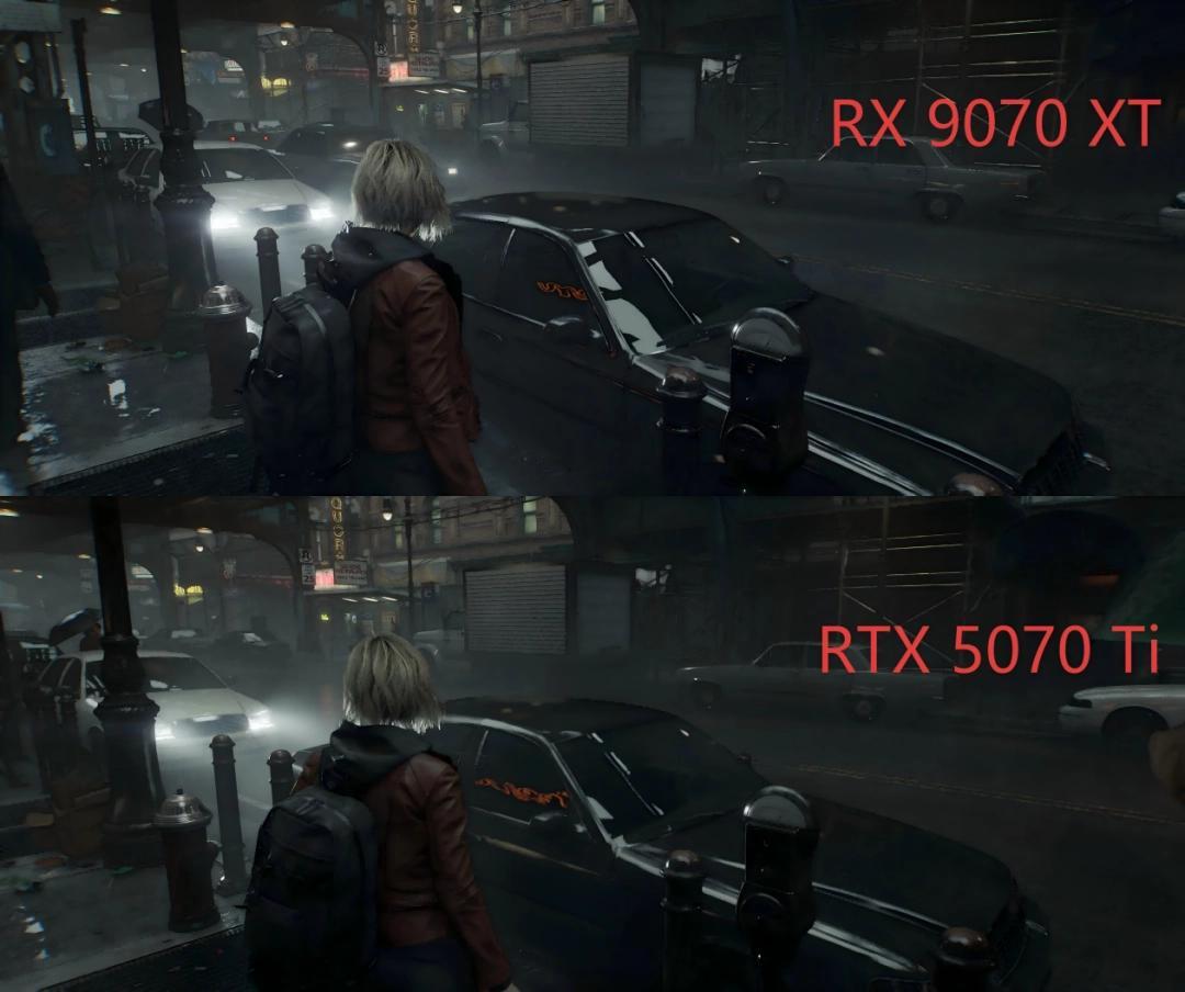 首先在《生化危機 安魂曲》中,我們對比了A卡和N卡全開光追後的表現,可以看出二者各有優勢,藍寶石PURE極地RX 9070 XT 16G D6 OC對水面和玻璃的光線反射處理得更加細膩,在雨天室外場景中能帶來更真實的觀感;而Geforce RTX 5070 Ti對角色服裝的陰影處理更富層次感,環境的明暗對比也會更加強烈。