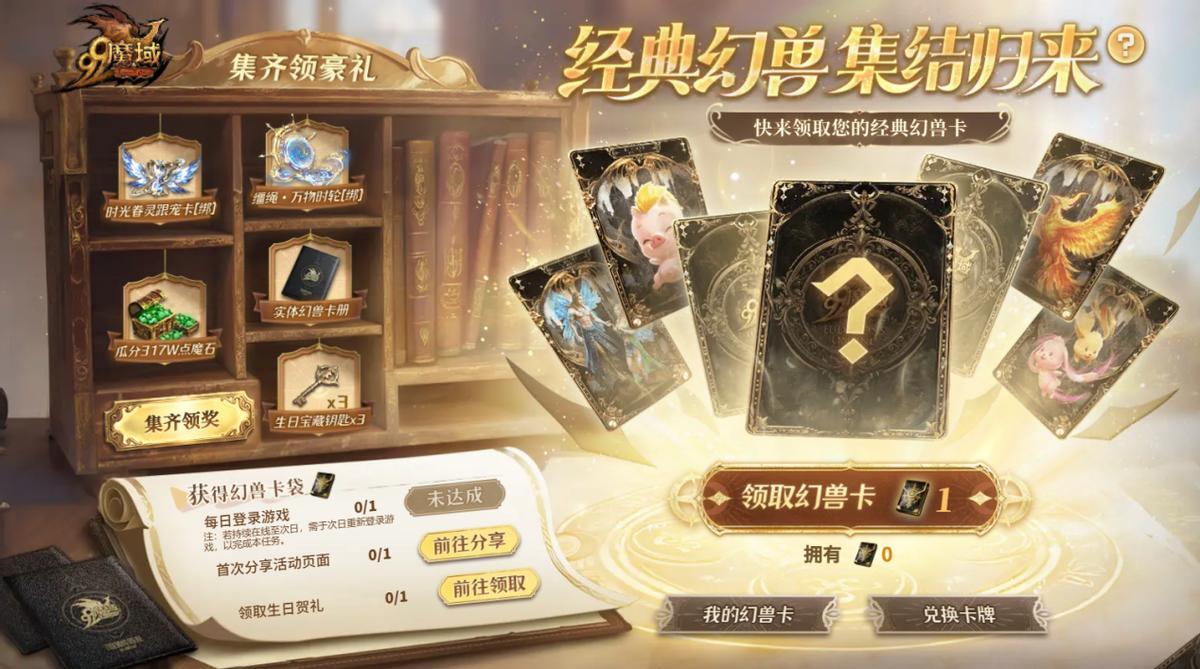 需要提醒大家的是:3月15日23:59前集齊全系列卡牌並達標的勇士,方可參與瓜分317萬點魔石獎池!時間所剩不多,還沒集齊的兄弟抓緊了——每日登錄遊戲、領取“生日賀禮”、玩家之間互贈卡牌,都是獲取經典幻獸卡的方式。