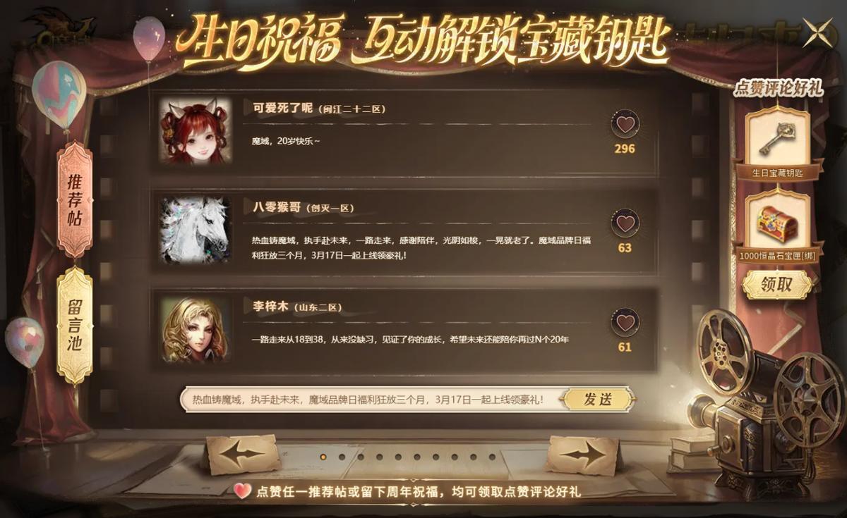 而鑰匙的獲取方式,本身就是一場情懷之旅:領取“生日賀禮”可得1把——這份賀禮裏還包含經典幻獸卡包、100級原初之火[綁]等;完成“個人回憶錄”分享可得1把——系統會生成獨屬於你的勇士史詩,記錄你在亞特大陸的點點滴滴;參與“留言祝福”活動再得1把——在留言池寫下祝福,或是點贊評論《魔域》官方內容,都能收穫這份迴響。