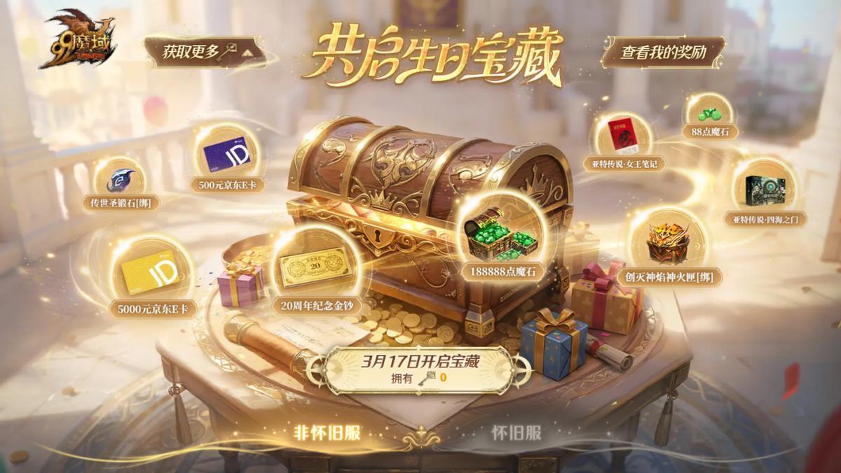 3月17日,“生日寶藏”將正式開啓。屆時使用“生日寶藏鑰匙”,最多可開啓8次寶藏,贏取20週年紀念金鈔、官方設定集、魔域主題劇本殺等實物周邊,以及188888點魔石、38888點魔石、創滅神焰神火匣[綁]、封靈籙[綁]等遊戲豪禮。