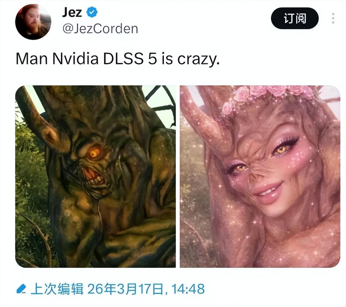 沒錯,咱DLSS 5就是這麼牛逼——哪怕你是一棵樹,只要跟着DLSS 5大哥混,也能混得人模人樣,有頭有臉。