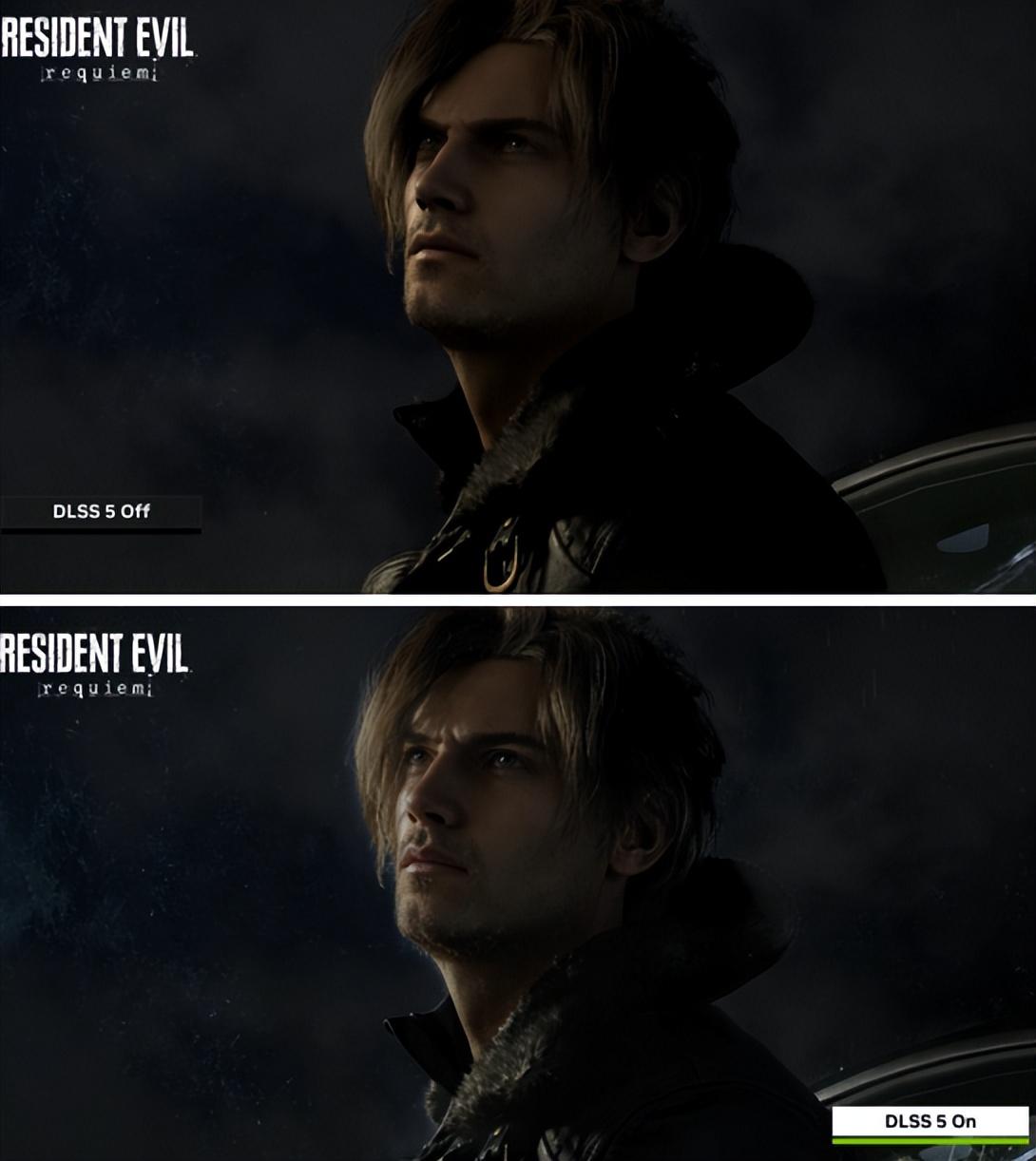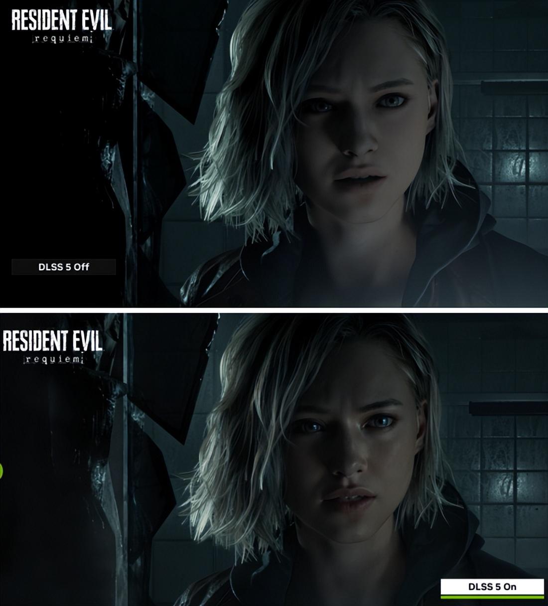 看完剛纔的畫面前後對比,你應該也注意到了一件事:遊戲角色的長相,似乎也隨着DLSS 5的開啓,發生了顯著改變——原本尚顯稚氣的格蕾絲,直接從職場新人被爆改成了臉部線條分明的精英白領,畫風都不一樣了。