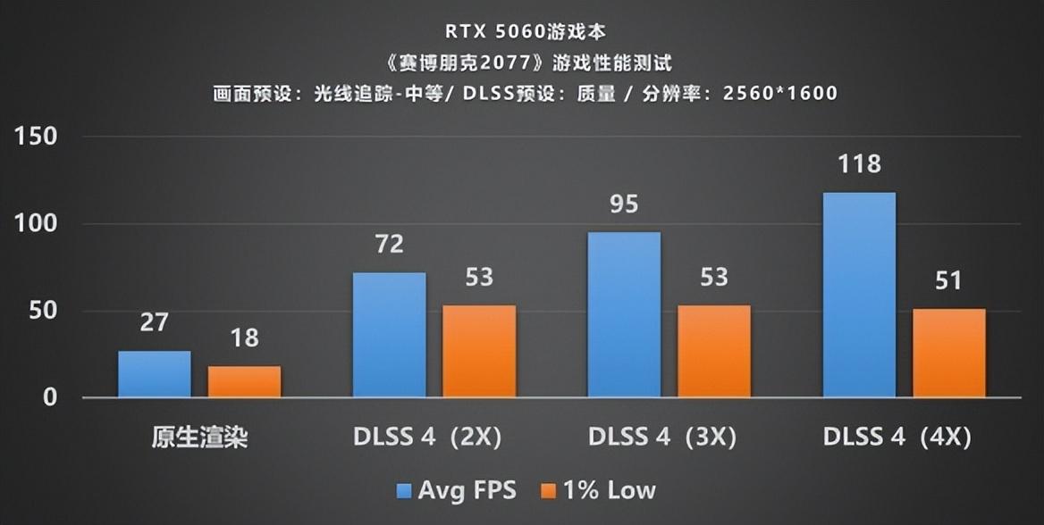 從結果不難看出,在2K分辨率與光線追蹤“中等”預設的中高級別的負載下,整機原生渲染的幀率表現並不盡如人意,甚至未能達到30幀,僅停留在27幀以下,這種卡頓感對遊戲體驗造成了明顯干擾。不過好在我們使用的是支持DLSS 4以及多幀生成技術的RTX 5060顯卡,在僅開啓2倍多幀生成的情況下,幀數竟直接翻了將近3倍,來到72幀的平均幀數,增幅之誇張令人咂舌;若進一步開啓DLSS 4 4倍多幀生成,幀率提升更是直逼118幀,相較於原生渲染完全不可同日而語,幀率增幅直接超出了372%之多,性能強悍恐怖如斯。