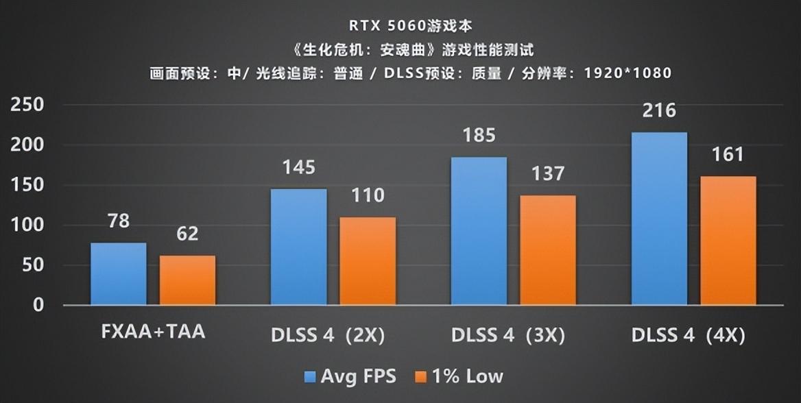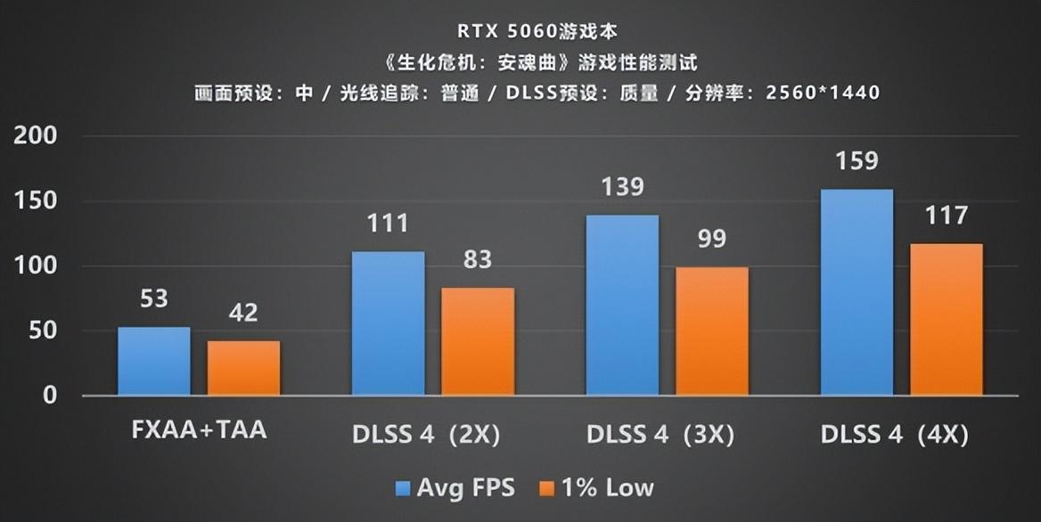 GeForce RTX 5060作爲一款主打性價比的顯卡,我們考慮測試2K和1080P分辨率下的性能表現。我們首先測試2K分辨率、普通光追檔位的遊戲畫質;在原生FXAA+TAA的原生渲染下,平均幀數只有53幀;接下來打開DLSS 4多幀生成模式,檔位調至2X時,原先的幀數突然翻倍,大幅提升至111幀,隨之我們繼續調節DLSS 4至3X,平均幀率又大幅上升至139幀,遊玩體驗可以說是絲滑無阻。不僅如此,當DLSS 4調整至4X時,幀數繼續提高到159幀,絲滑遊玩早已綽綽有餘。