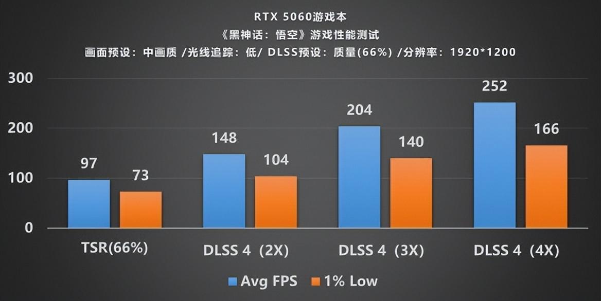 接着我們測試1080P分辨率時遊玩《黑神話:悟空》幀率的表現,結果依舊不變,在使用默認TSR渲染的時候,遊玩幀率只有97幀,屬於勉強可玩的水平,接下來開啓DLSS 4幀生成,遊戲幀數有了相當可觀的增幅,在2倍幀生成下,幀率達到了148幀,相比之前暴漲了50%;緊接着開啓3倍多幀生成時,幀數又增加到204幀,增加了56幀,增幅達37%;最後在最高4倍幀生成時,幀數突破了250幀,絲滑暢玩《黑神話》已毫無問題。