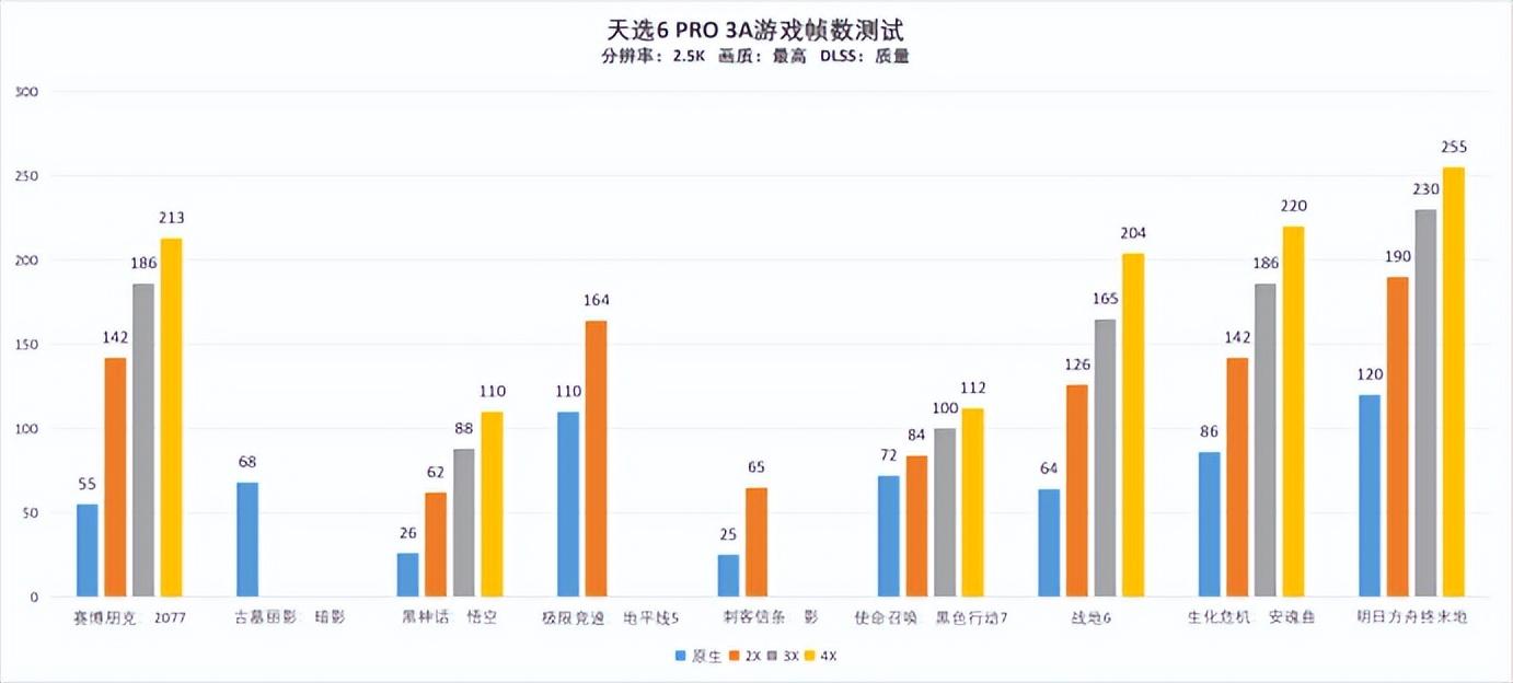在不開啓幀生成前,可以看到所有遊戲中除了《刺客信條:影》和《黑神話:悟空》無法用GeForce RTX 5060筆記本電腦GPU穩定跑到30幀外,其他遊戲的平均幀數都能維持在60幀左右甚至更高,如果你平時也玩《明日方舟:終末地》這類對配置要求不是很高的二遊,那麼跑滿遊戲預設的120幀上限可謂毫無難度。開啓DLSS 4最高4倍多幀生成後,所有遊戲的幀數表現都有了顯著提升(《古墓麗影:暗影》不支持幀生成),其中除了《極限競速:地平線5》和《刺客信條:影》的幀生成功能只有簡單的開關選項外,其餘遊戲均可根據玩家需要,在2倍幀生成、3倍多幀生成、4倍多幀生成中自由選擇。從實際結果來看,這些遊戲大多能在開啓4倍多幀生成後,獲得平均2.2倍的幀數提升,最誇張的《黑神話:悟空》和《賽博朋克2077》能將幀數提升至原來的近4倍,表現一般的《使命召喚:黑色行動7》,也能將幀數提升至原本的1.5倍。