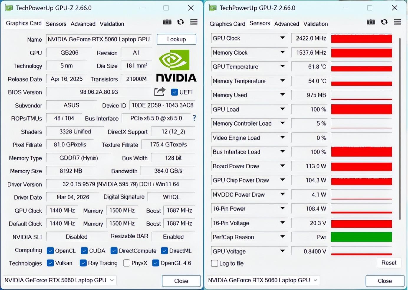 性能方面,這臺天選6 PRO搭載了功耗115W的GeForce RTX 5060筆記本電腦GPU,它基於Blackwell架構打造,配備GDDR7 8GB顯存,支持DLSS 4多幀生成,可顯著提升玩家的遊戲體驗。我們也對顯卡進行了20分鐘的單烤,最終顯卡功耗穩定在了113W,溫度62度,頻率爲2500MHz左右。