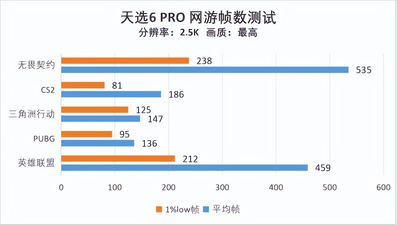 網遊方面,天選6 PRO的GeForce RTX 5060顯卡也取得了穩定發揮。所有測試遊戲的平均幀均在120以上,稍微調整一下畫質選項,跑滿這塊屏幕的165Hz刷新率都是輕而易舉的,尤其是在《無畏契約》《英雄聯盟》這兩款優化向來出色且不怎麼喫配置的遊戲裏,GeForce RTX 5060可以輕鬆把平均幀拉到500左右,1%low幀也穩定在200以上,綜合考慮對於學生黨網遊玩家來說絕對會是一款極具性價比且耐用的產品。