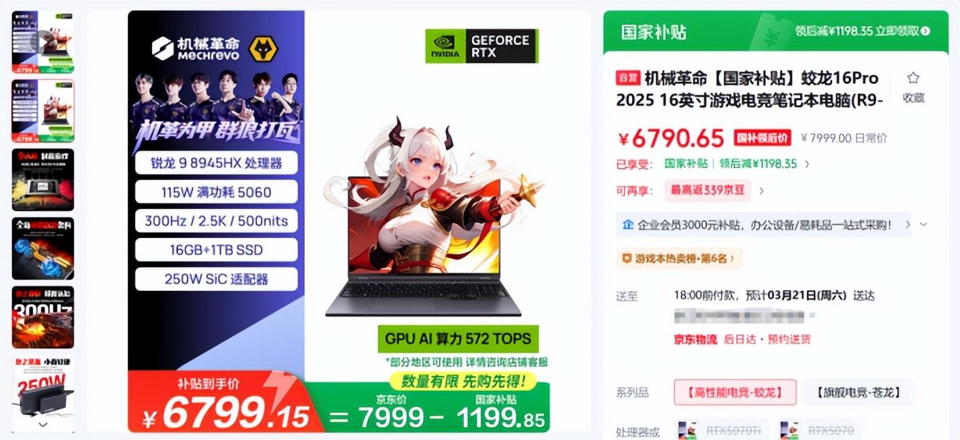 在此基礎上,如果你是堅定的機械革命粉絲,同時更看重屏幕高刷,那麼下面這臺機械革命蛟龍16Pro或許會是更適合你的選擇。它搭載AMD 銳龍9 8945HX處理器和滿功耗115W的GeForce RTX 5060筆記本電腦GPU,屏幕刷新率高達300Hz,亮度500nits,更適合對幀數要求較高的FPS遊戲玩家。與此同時,它配備了80Wh大容量電池和250W輕量化SiC電源適配器,支持140W私有協議PD快充和100W標準協議PD快充,日常出行使用更加方便。國補後6799元的價格依舊很香。