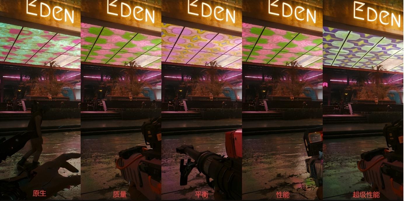 這次測試的3A遊戲,全部支持原生DLSS超分辨率技術,我們也在部分遊戲中截取了開啓不同超分辨率檔位後的畫面進行細節對比。以畫面元素多爲複雜城市霓虹光影的《賽博朋克2077》爲例,可以看到在DLSS“質量”檔位下,遊戲的畫面表現最佳,切換到“性能”或“超級性能”後,放大看細節會有一定的模糊,但整體並不影響正常觀感和遊玩。