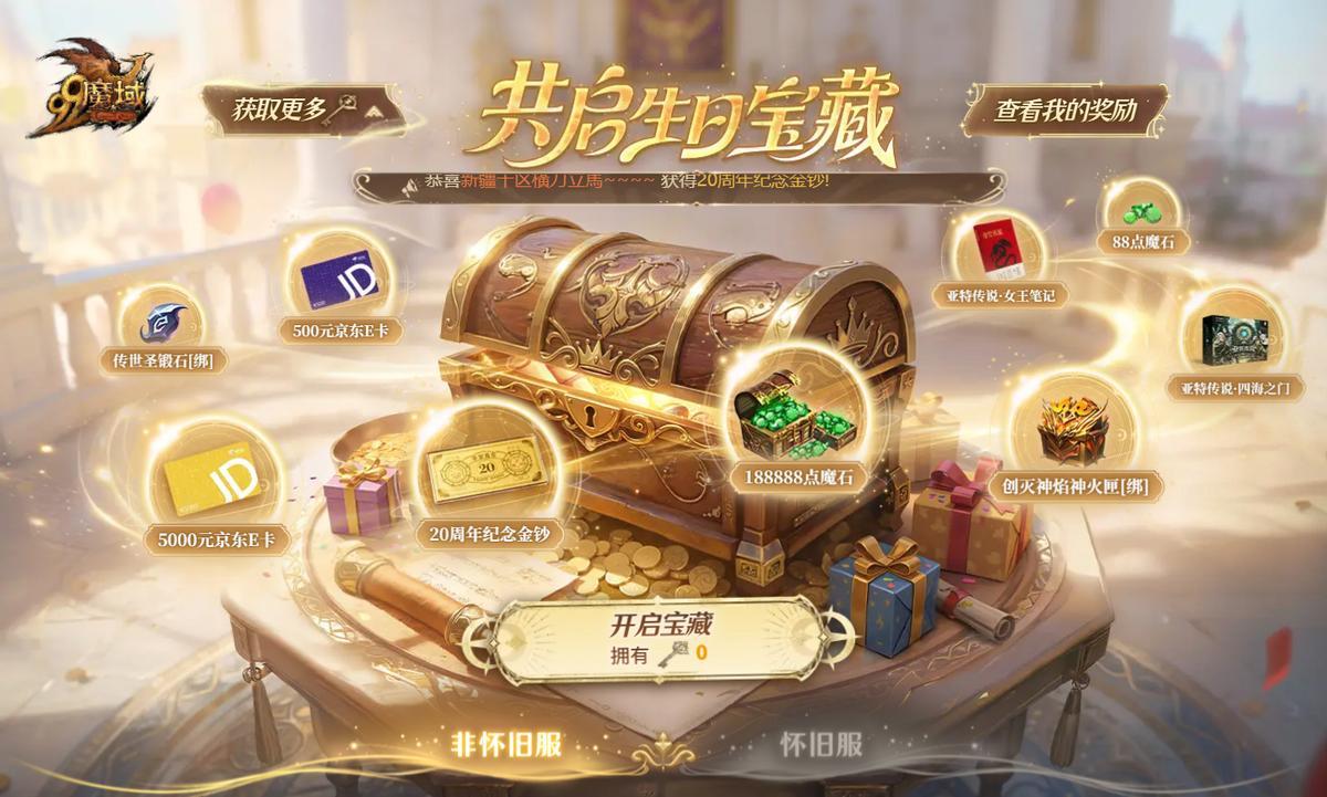 作爲本次317品牌日慶典的重頭戲,“生日寶藏”無疑是硬核寵粉的巔峯。活動截止前,每位玩家仍有機會使用“生日寶藏鑰匙”,開啓這座蘊藏着全球限量20週年紀念金鈔的終極寶庫。這不僅是真金白銀的實物獎勵,更是對二十年熱血的最高致敬。此外,寶藏內還藏着海量遊戲內豪禮,如高達188888點的魔石、創滅神焰神火匣【綁】等,每一份都價值連城。