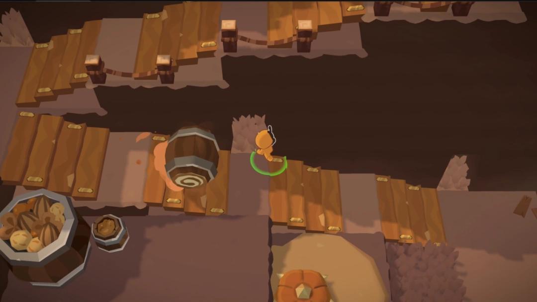 除此之外,本作在基本的關卡元素設計上也下足了功夫,許多箱庭探索遊戲的經典要素都在《餅乾人聯盟》中得到了致敬與重現——就比如剛纔提到的經典礦車關,就曾在《咚奇剛》等遊戲中大放異彩,而3-4中躲避滾落木桶的關卡,也讓我想起了經典的《馬力歐64》炸彈國王關。