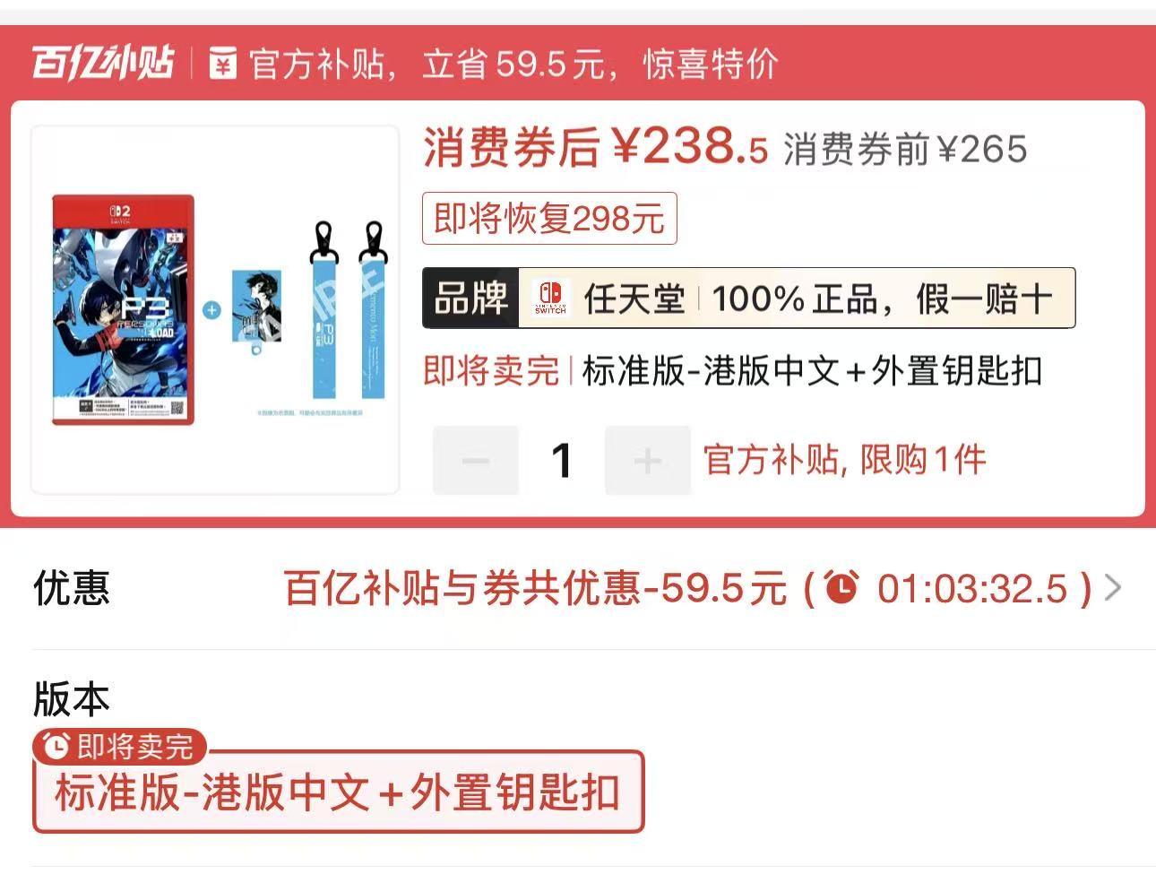NS2港版中文《女神異聞錄3重製版》238.5元全新包郵(鑰匙卡)