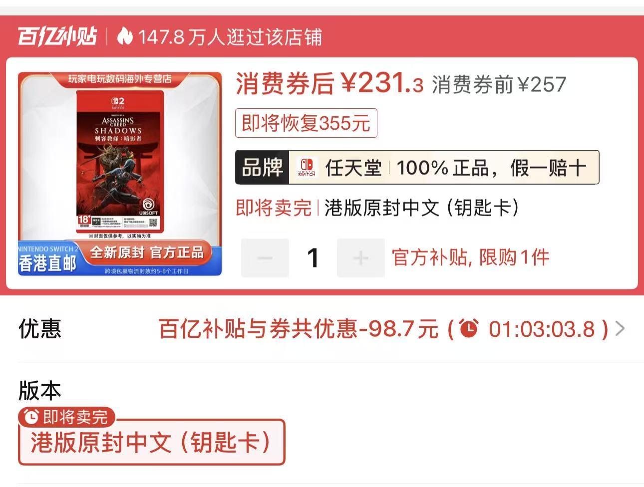 NS2港版中文《刺客信條:暗影》231.3元全新包郵(鑰匙卡)
