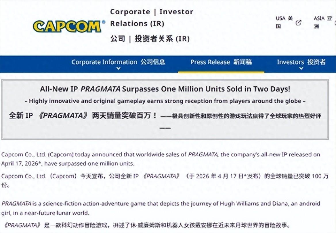 卡普空正式宣佈,其於2026年4月17日發售的科幻動作冒險遊戲《識質存在》,全球銷量在發售僅兩天內便突破100萬份,創下全新IP首發銷量佳績。該作以近未來月球世界爲背景,講述了主角休・威廉姆斯與機器人少女戴安娜攜手踏上冒險旅程的故事。世界觀融合了 “月絲” 物質等科幻設定,極具沉浸感。