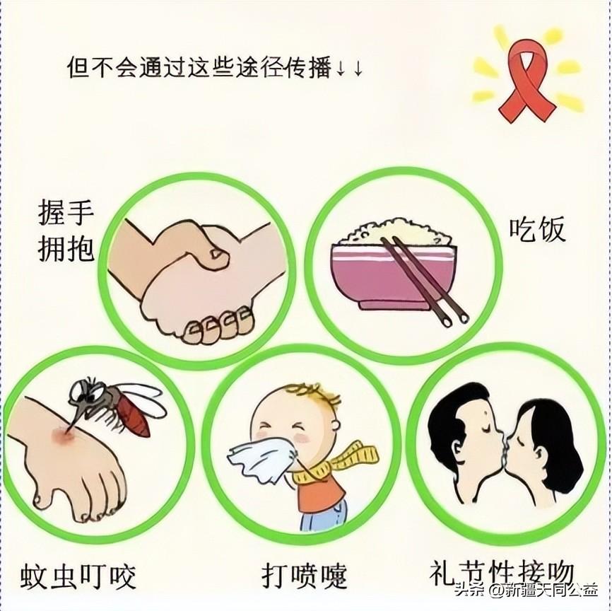 但是握手、擁抱、禮節性接吻;共用餐飲具;共用辦公用具、工具、電話、錢幣;共用衛生間、游泳池或浴池等公共設施;這些行爲不會感染艾滋病。另外,咳嗽、打噴嚏及蚊蟲叮咬都不會傳播艾滋病。