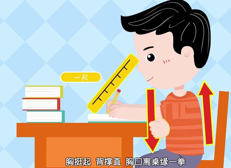 讀書寫字做到“一尺、一拳、一寸”,即眼睛離書本一尺,胸口離桌沿一拳,握筆的手指離筆尖一寸。
