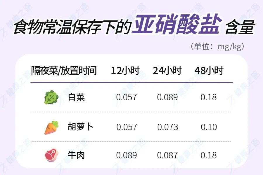 而以白菜、胡蘿蔔、牛肉爲代表,煮熟後放置在常溫下的亞硝酸鹽含量爲[3]:
