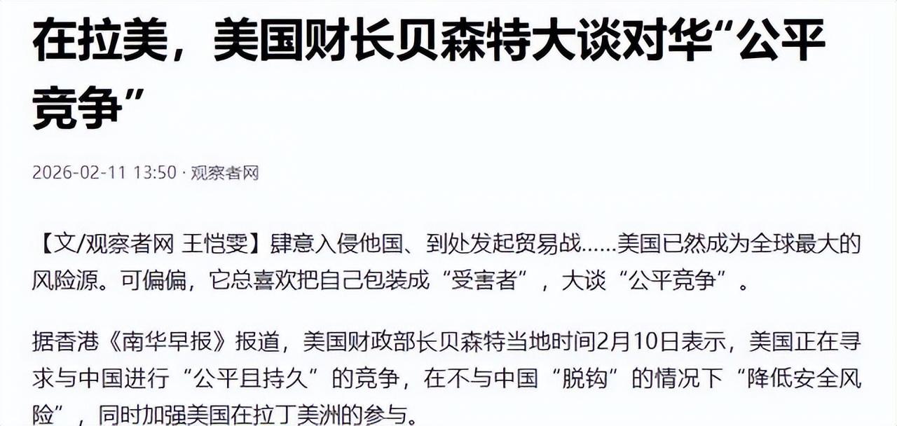 美國財長斯科特·貝森特2026年2月10日在巴西聖保羅會議上說,中美關係處在舒適位置,會保持競爭但不脫鉤,得去風險。這話想穩住經貿聯繫,美方離不開中國供應鏈和技術合作。