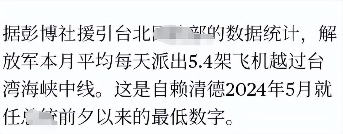 臺軍發現不對勁,解放軍戰機巡臺次數陡降,日均僅5.4架次軍機越過臺海中線,創下賴清德就任臺地區領導人以來的最低紀錄,臺媒認爲解放軍訓練方向有所轉變,只能說好戲還在後面?