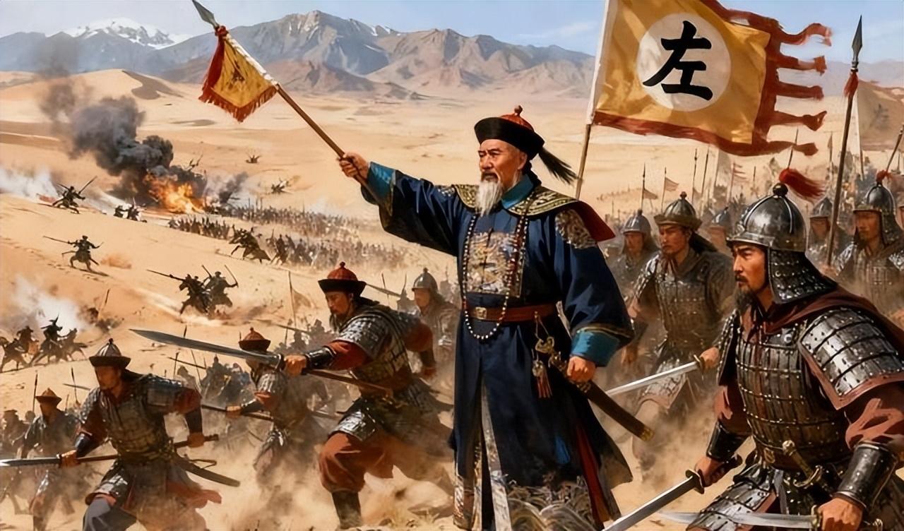 左宗棠不這麼想,他覺得新疆是西北屏障,丟一寸就等於自斷臂膀。1875年,他請纓西征,從甘肅出發,帶兵逐步推進。軍隊在沙漠裏艱難行軍,補給全靠後方運糧。